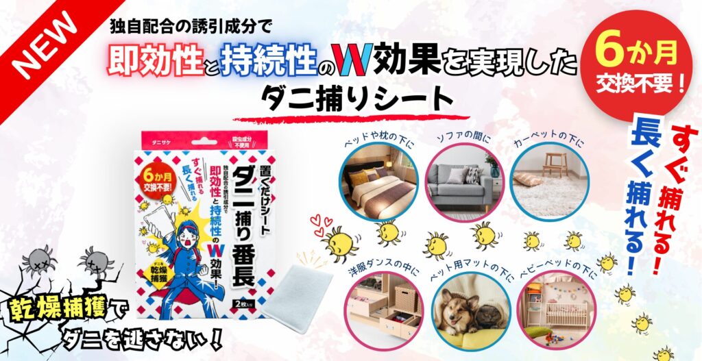 2026.02.03 お知らせ, ショップニュース ★新商品のご紹介★ この度、ダニ捕りシート「ダニ捕り番長」を発売いたしました! 発疹や鼻がムズムズしてお困りの方、もしかするとダニのせいかも? なるべく手間をかけずにダニ対策をしたい方、殺虫成分が入ったものには 抵抗のある方…そんな方におすすめの商品です。 詳しくは下の画像をタップしてご覧ください。 前へ 一覧へ