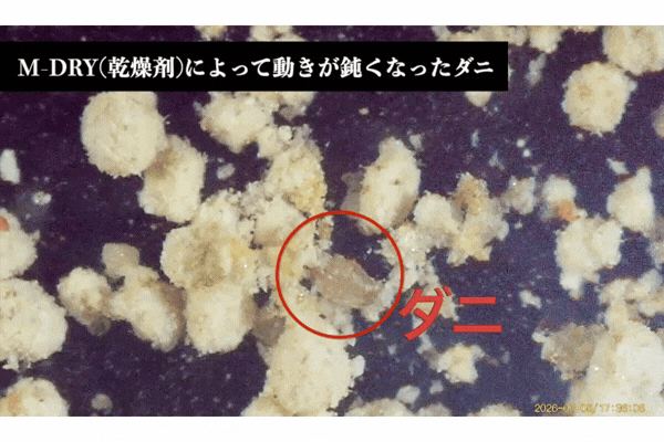 ダニの体に含まれる水分は約70~80%と言われています。M-DRYがダニの体に付着すると急速に水分を奪うので、ダニはカラカラに乾燥し弱って動けなくなります。